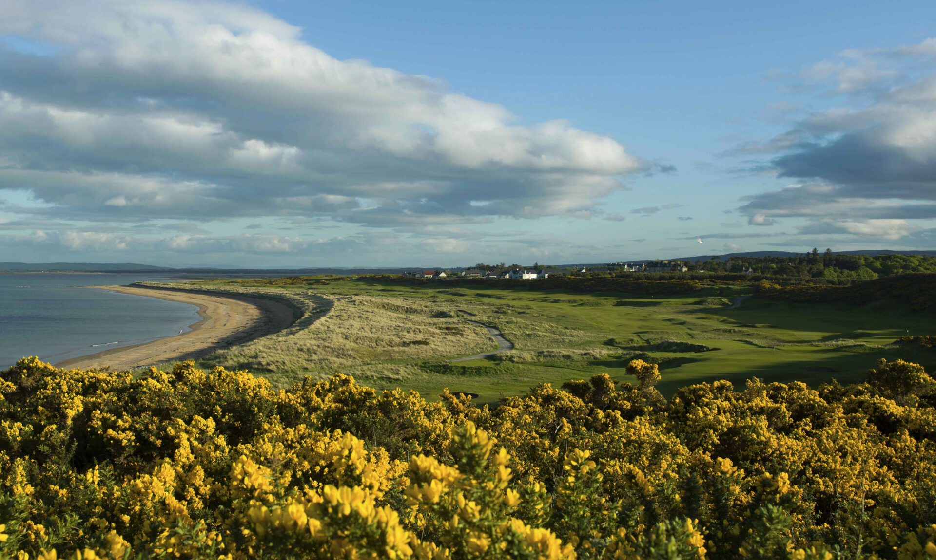 The curving bay of the Dornoch Firth and its magnificent white broad beaches are backed by a narrow strip of softly contoured dune land rising in two distinctive levels, providing just enough room for parallel fairways. The ridges, hillocks, dunes and undulating links land have all the characters of the best of links courses, and most of the difficulties.