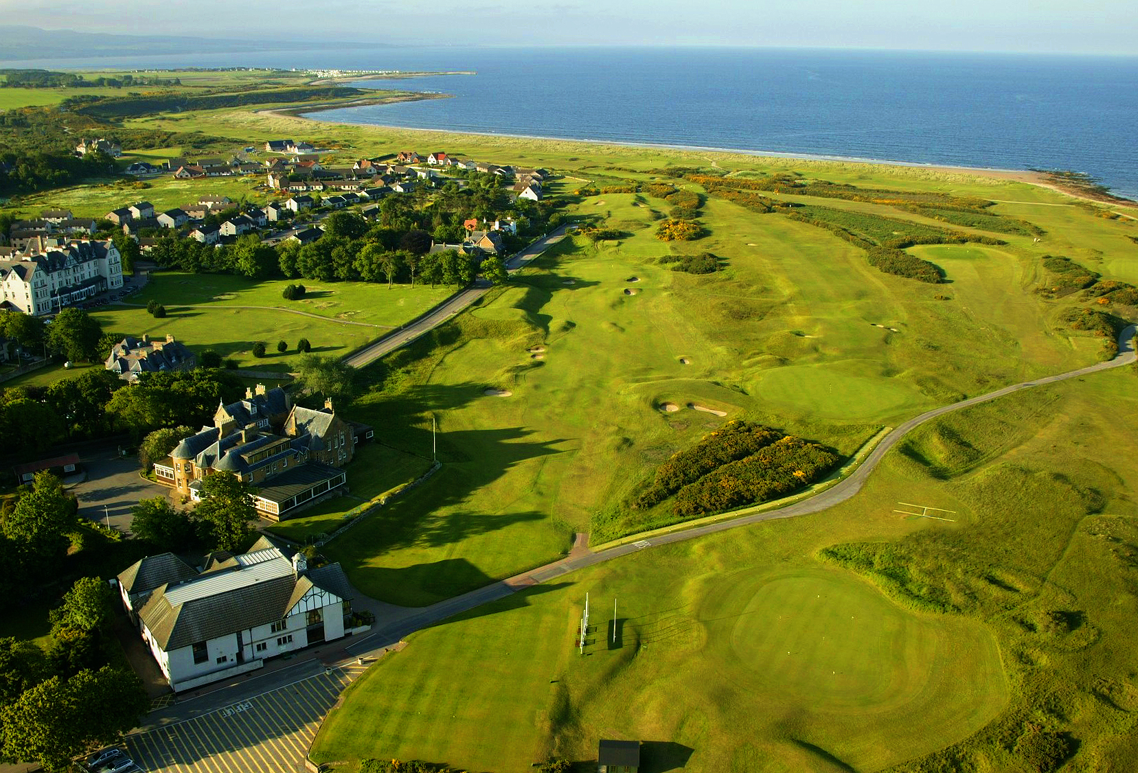 The first eight holes follow the ridge and the remaining ten holes played in the opposite direction are bounded, except the 17th and 18th on the left by the sandy beaches of the firth.